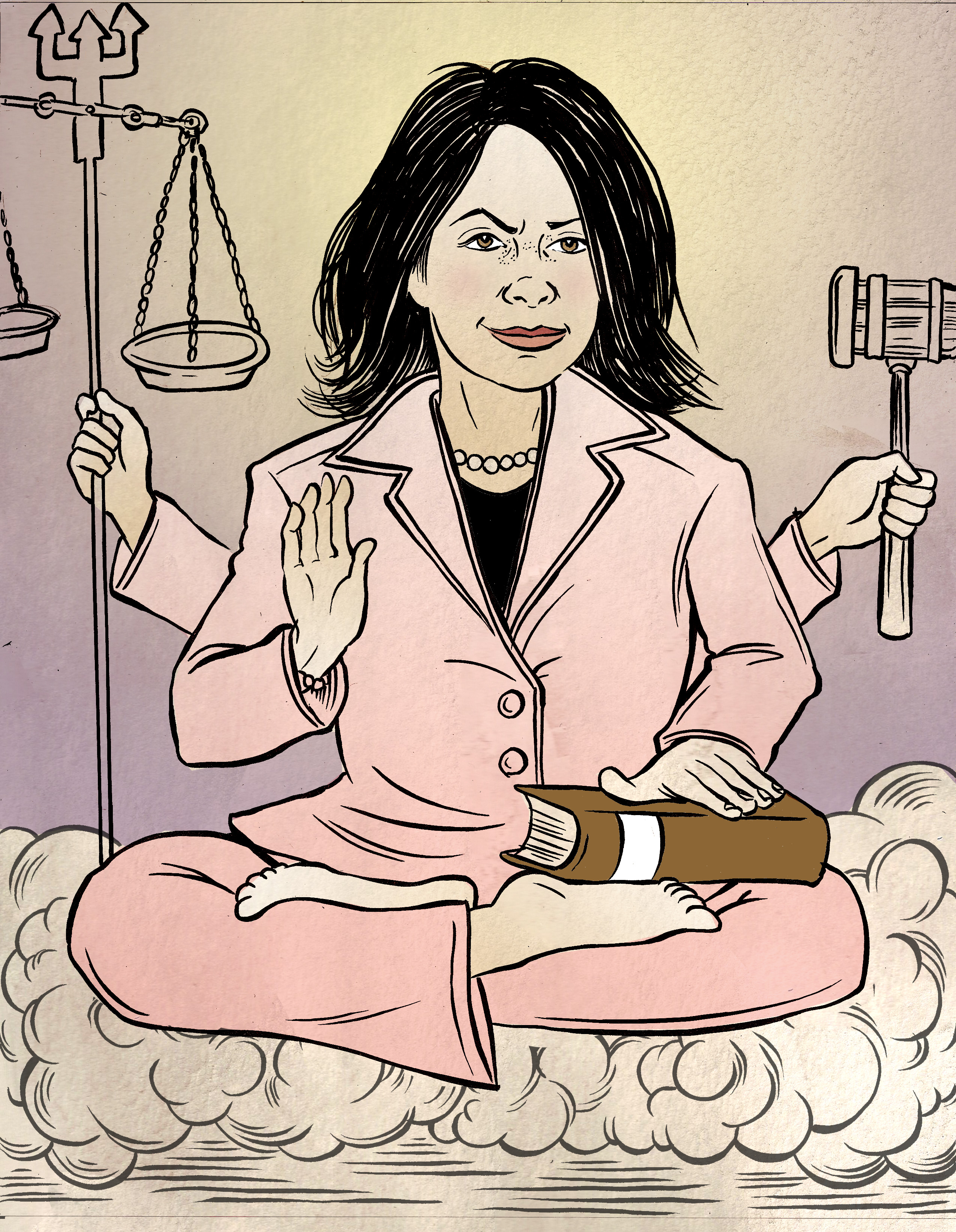 First I would like to commend you on penning the most posh piece of hate mail we have gotten to date — and there have been some impeccably crafted forked-tongued missives, believe you me. (I was going say “articulate” but that would just open a whole other can of worms.) Second, I would like to make clear that the idea to draw your sister as Shiva (yes, I asked for Shiva, NOT Vishnu) was, for better or worse, mine and mine alone and I take full responsibility. It is my understanding that Shiva is both Destroyer and Benefactor and I thought that was emblematic of your sister’s broad satire of the judiciary.