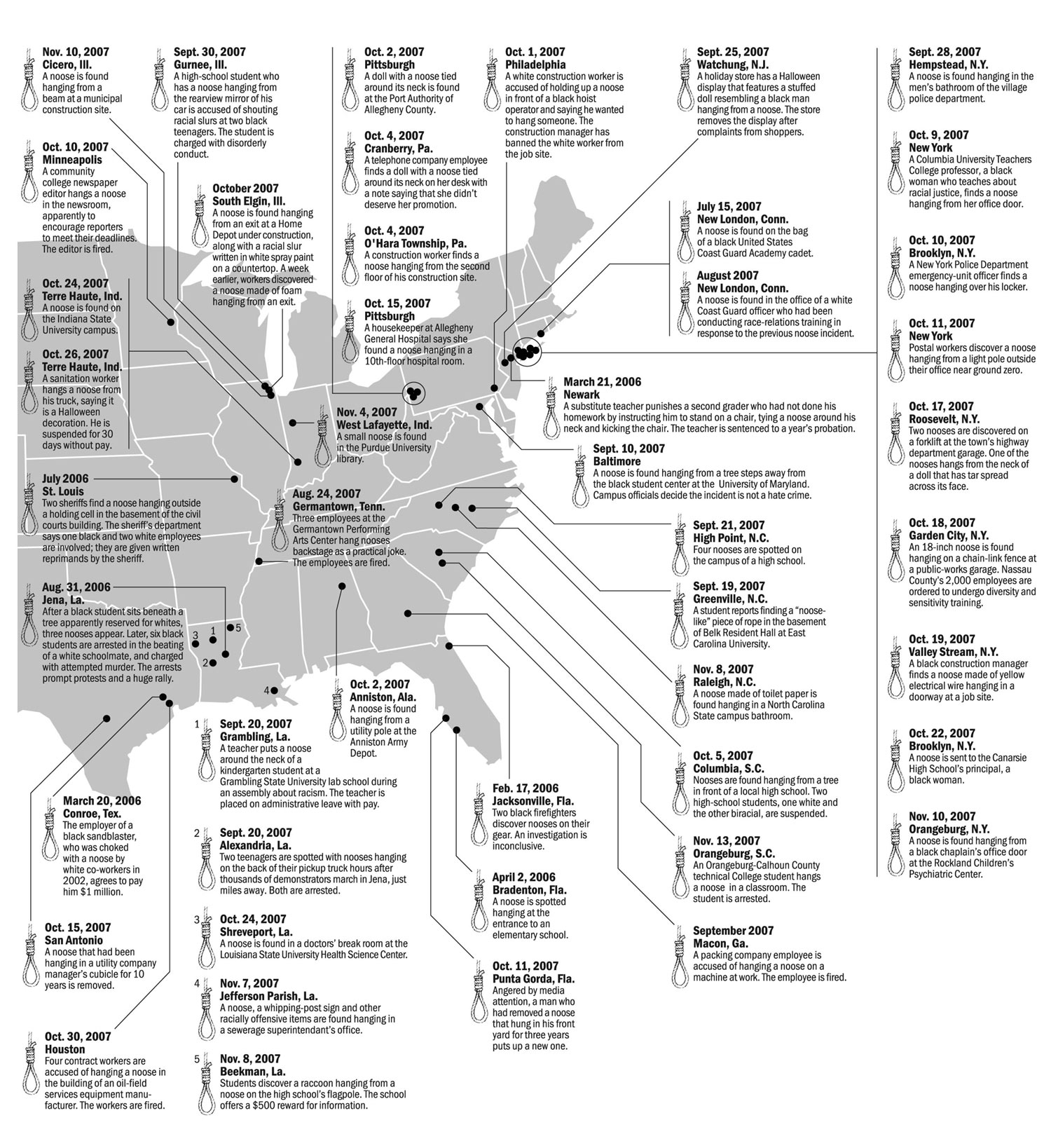 FROM the 1880s to the 1960s, at least 4,700 men and women were lynched in this country. The noose remains a terrifying symbol, and continues to be used by racists to intimidate African-Americans (who made up more than 70 percent of lynching victims). In the past decade or so, only about a dozen noose incidents a year came to the attention of civil rights groups. But since the huge Sept. 20 rally in Jena, La., where tens of thousands protested what they saw as racism in the prosecution of six black youths known as the “Jena 6,” this country has seen a rash of as many as 50 to 60 noose incidents. It seems that the September rally in Jena — much as it was seen by many civil rights activists as the beginning of a new social movement — signaled not a renewed march toward racial and social justice, but a surprisingly broad and deep white backlash against the gains of black America. MORE