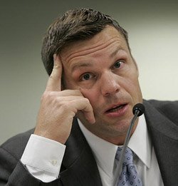 And then there’s Kris Kobach, [pictured, below right] the controversial Kansas Secretary of State and anti-immigrant extremist who’s Mitt’s close confidant and endorser as well as his top adviser on immigration issues. Actual Kobach quote: “If you want to create a job for a U.S. Citizen tomorrow, deport an illegal alien today.” But perhaps his greatest claim to infamy, as his own website so proudly proclaims, is eagerly assuming the role of opposing litigator-in-chief in any matter that offers up the ACLU as adversary. Did I mention that he’s also a Constitutional Law professor running for Congress who doesn’t cotton to separating church from state. When questioned about soliciting votes on the basis of his Catholicism, his campaign spokesman replied, “That’s ridiculous, there’s no expressed separation of church and state in the Constitution.”
