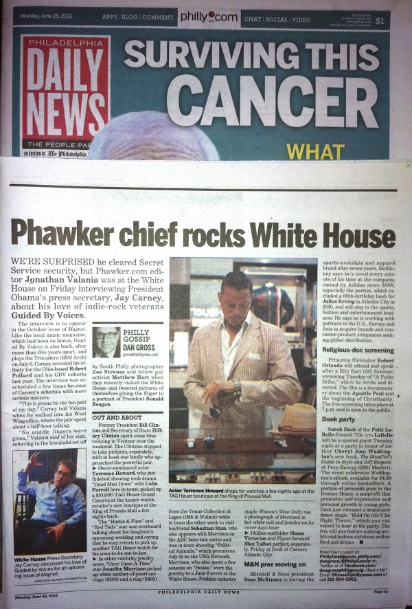 DAILY NEWS: We’re surprised he cleared Secret Service security, but Phawker.com editor Jonathan Valania was at the White House on Friday interviewing President Obama’s press secretary, Jay Carney, about his love of indie-rock veterans Guided By Voices. The interview is to appear in the October issue of Magnet. Like the local music magazine, which had been on hiatus, Guided By Voices is also back, after more than five years apart, and plays the Trocadero (1003 Arch) on July 6. Carney revealed his affinity for the Ohio-based Robert Pollard and his GBV cohorts last year. The interview was rescheduled a few times because of Carney’s schedule with more serious matters. “This is gonna be the fun part of my day,” Carney told Valania when he walked into his West Wing office, where the pair spent about a half-hour talking. “No middle fingers were given,” Valania said of his visit, referring to the brouhaha set off by South Philly photographer Zoe Strauss and fellow gay activist Matthew Hart when they recently visited the White House and tweeted pictures of themselves giving the finger to a portrait of President Ronald Reagan. MORE
