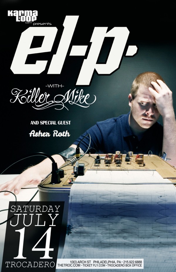 As per Wikipedia: “El-P (originally known as El Producto, born Jaime Meline, March 2, 1975) is an American hip hop artist and entrepreneur from Brooklyn, New York City. Originally a member of Company Flow, El-P has been a major driving force in alternative hip hop for over a decade. As a rapper, El-P’s style can be characterized by his dense, aggressive, and verbose attacks, which include notable use of metaphor, science fiction and fantasy themes and references, and associative word play. Critic Steve Huey describes him as “one of the most technically gifted MCs of his time, spitting out near-impossible phrases and rhythmic variations that simply leave the listener’s head spinning.” [5] El-P is a fan of science fiction, notably writer Philip K. Dick, and many of Dick’s themes, such as paranoia and questions about the nature of reality, feature in El-P’s work. References to George Orwell, Arthur C. Clarke, and Star Trek spin-off Deep Space 9 sit comfortably alongside more traditional rap references, such as to the likes of LL Cool J and Boogie Down Productions. As a producer, Meline is notable for his innovative mix of bleak futurism and low fidelity sounds. His dense, claustrophobic sounds are strongly influenced by Public Enemy‘s production team, The Bomb Squad, as well as other electronic artists like Art of Noise and Nine Inch Nails.” In the immortal words of the dearly departed Andy Griffin: That’s a gooooooood cracker! El-P plays the Troc on Saturday. We have two pairs of tickets to give away to the the 9th and 10th lucky Phawker reader to sign up for our mailing list (below, right, under the masthead). Fear not, your email address will NEVER be sold off to third party marketing scum. We promise.