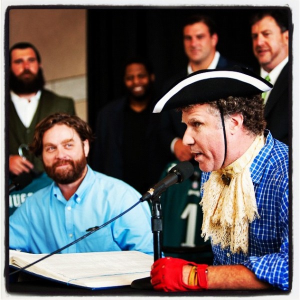 Will Ferrell and Zach Galifianakis [plus some sort of sports guys] sign the U.S. Constitution while promoting their new movie The Campaign at the NCC yesterday BY ROBIN ODLAND