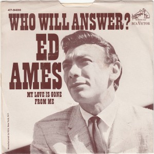 Like so many other crooners in the late ‘60s, singer/actor Ed Ames (who’d had a hit with “My Cup Runneth Over” but was better known for his role on the Daniel Boone TV series) attempted to tap into the youth market by releasing an album of songs by then-popular acts like Dylan, The Mamas & Papas, and The Monkees. Most such efforts were just embarrassing, but Who Will Answer? is surprisingly good, and Ames’ deep baritone was never in better form. What sets the album apart is the opening title track. It introduces an album aimed at hippies with an epic, piece-by-piece dismantling of the emptiness and nihilism of that lifestyle. Beyond that, it’s also a great, majestic, and surprisingly contemporary song which, in a strange way, almost presages “Bohemian Rhapsody” with its shifting styles, background choirs, and soaring vocals. Here’s a sample lyric: High upon a lonely ledge, a figure teeters near the edge, And jeering crowds collect below, To egg him on with, “Go, man, go!” But who will ask what led him, To his private day of doom, And who will answer? After Ames demolishes the counterculture, “Blowin’ in the Wind” doesn’t seem nearly as profound. “Who Will Answer?” was also released as a single and reached No. 6 on the Billboard Adult Contemporary chart and 19 on Billboard’s Hot 100. — JIM KNIPFEL