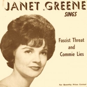 While Joan Baez reigned as the Queen of Folk, an Orange County John Birch-related label counteracted with right-wing folkie Janet Greene, who made a few 45s based on paranoia of a communist takeover. She recorded ditties like “Fascist Threat,” a bouncy number where she lectures us on how fascism and communism are one and the same. “Commie Lies”, sung to the tune of “Blue Tail Fly,” warns us of impending centralization and the theft of our freedoms. It wouldn’t be too out of place at a Tea Party rally today. These two catchy sing-along numbers, however, don’t prepare us for her masterpiece, “Poor Left Winger,” in which she sings from the point of view of a poor young girl under the spell of a bearded singer “twanging a plaintive folk song spreading the Communist word” at the local coffeehouse. Tragically, this naïve young lady is left in the gutter because she believes the hippie’s evil rhetoric. The fear, anger, and sarcasm in this song reflect the concerns of (then) far-right Americans. Lots of patriotic/right-wing 45s were cut back in the day, sung (or recited) by middle-aged men with orchestral backing. Greene’s releases remain especially memorable for her voice, style, and sincerity. It’s not a stretch to imagine her singing “The Times They Are A-Changin’” in Washington Square, though likely in a different context. –BRIAN GORDON