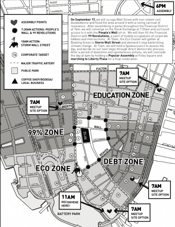 S17NYC.ORG: On September 17, we will occupy Wall Street with non-violent civil disobedience and flood the area around it with a roving carnival of resistance. After assembling in parks throughout the Financial District at 7am, we will converge on the Stock Exchange at 7:30am and surround it with the “People’s Wall” sit-in. We will then fill the Financial District with “99 Revolutions,” a swirl of mobile occupations of corporate lobbies and intersections. At 10am, the Eco Cluster will gather at Bowling Green to “Storm Wall Street” and demand it stop bankrolling climate change. At 11am, we will assess the day, and decide on how to proceed through direct democratic process. After a period of downtime and spontaneous actions, we will conclude the day at 6pm by holding a Popular Assembly at Foley Square and marching to Liberty Plaza for a final celebration. Want to figure out how to plug into one of the actions? Check out the tactical map and explanatory pages below, and be sure to make one of the many trainings we have scheduled throughout the week. MORE