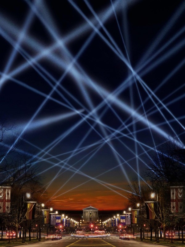BY BRANDON LAFVING ARTS CORRESPONDENT Open Air, Rafael Lozano-Hemmer’s synchronous, bat signal-esque ballet of light has been illuminating the Philly nightscape since September 20th and will continue to do so until October 14th. Open Air is interactive in the best sense of the word. The installation’s 24 dancing searchlights are choreographed by the voices of participants who submit messages via the Open Air web site or iPhone app. It’s kind of like those dancing flowers we all thought were so funny and cute back in the 90s, but with light sabers. In the midst of all the stress and chaos of prepping for opening night, Lozano-Hemmer took time out to talk to Phawker about Nazis, Buckminster Fuller, Sun Ra, The Roots, David Lynch, Google Earth, Post-Structuralism, and the intersections of art and science.