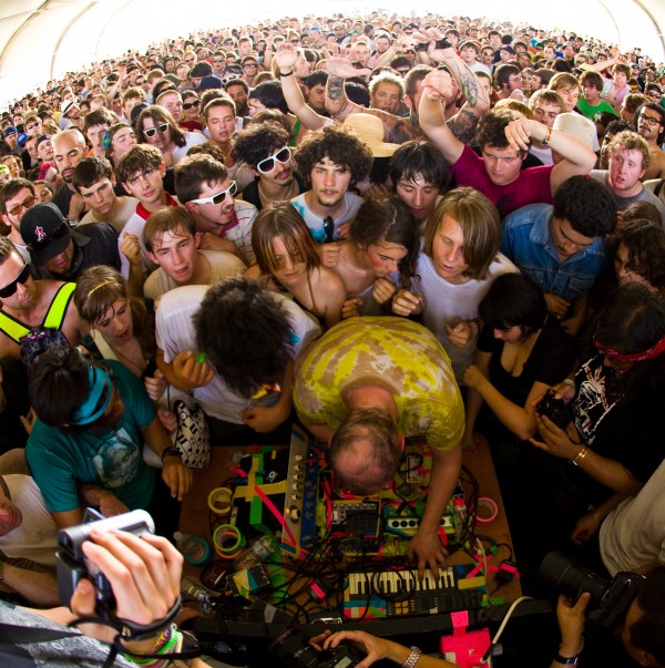 Bulky, bearded and balding, rocking a droopy T-shirt and his trademark red Sally Jesse Raphael frames, Deacon looks more like a roadie than a rock star. And yet he is. Taking the stage to the rock-operatic strains of Queen’s “Bohemian Rhapsody,” during which the near-capacity crowd sang along with every word, Deacon started off the show with an absurdist self-actualization exercise that somehow incorporated your Netflix queue, a mythical Criterion Collection edition of Deuce Bigelow and “wafers, delicious wafers,” before launching into the freaky tribal stomp of “Of The Mountains.” This set the agenda for the rest of the night: prismatic, psychotropic electronica combined with giddy group exercises that required and received full audience participation. MORE