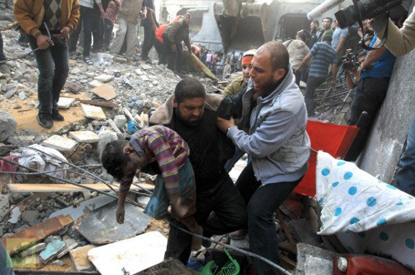A Palestinian man carries the dead body of a child from the al-Dallu family out from the rubble after an Israeli missile struck a family home killing at least seven members of the same family in Gaza City on November 18, 2012. Via AFP
