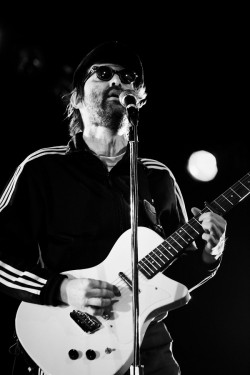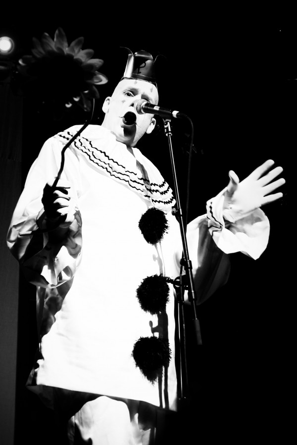 The Eels have a history of odd opening acts. That streak continued on Saturday night, with opener Puddles Pity Party. Puddles [pictured, above]  is a six foot five clown clad in a white outfit who arrived on the World Café Live stage after shambling through the crowd with a lantern and suitcase in hand. He stood at the mic silently and stared into space for what felt like a nine months before opening his mouth. When he did finally sing he stunned the crowd with a short set of heartbreak ballads served up lounge style with a theatrical Bowie-esque voice. The highlight was Puddles delivering possibly the only listenable version of “My Heart Will Go On” ever performed. Suck it, Celine Dion. The packed house showed appreciation for the clown but were clearly there to see The Eels, the long running project of one Mark Oliver Everett aka E [pictured, right]. The Eels have generally been E composing songs and then recording an album with a rotating cast of players. Their new album, the excellent Wonderful, Glorious, was a collaborative effort, with the current band writing and recording the album as a unit and touring together. E and his band of tough looking cohorts displayed their solidarity by taking the stage clad in matching black tracksuits. They launched into “Bombs Away” and didn’t look back for 90 minutes of Eels style-ballads of love, loss and bad luck slathered in bluesy psychedelic pop. The band was tight and rocked the house with a winning blend of infectious enthusiasm and raw loudness. The set list was largely devoted to the new album along with a couple of surprising covers – a thundering stop-and-start version of Fleetwood Mac’s “Oh Well” and a chiming, crowd-slaying romp through The Small Faces’ “Itchycoo Park.” They closed with the title track of the new album “Wonderful, Glorious” a blast of psychedelic sunshine with some Beach Boy harmonies about how “every night you spent shrouded in darkness has led you to this moment in the light” with the promise that “the sum of all the love inside your heart, will get you through your plight.” Which is really just another way of saying that in the end the love you make is equal to the love you take. Amen to that. — PETE TROSHAK