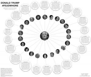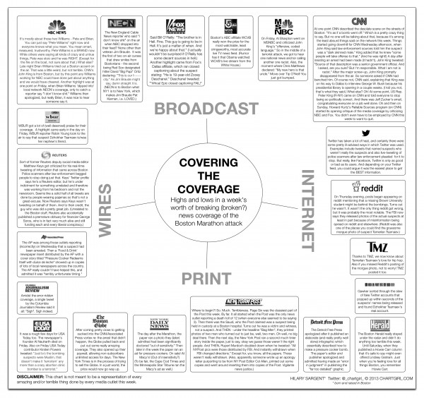 In early December, with John McAfee on the lam, Sargent extracted from the event the three dozen most important institutions, individuals and plot elements (e.g., a tampon, four poisoned dogs, Vice magazine, “bath salts”) and arranged them like wheel spokes around a McAfee head shot to bring coherence to the tumult. Later that month, Sargent applied her news-mapping skills to the awfulness of the Westboro Baptist Church and to Donald Trump‘s feuds with such celebrities as Rihanna, Carrie Prejean, Rosie O’Donnell, Al Neuharth and Stephen Colbert. Since then, she’s diagrammed the news behind the Bill Ackman vs. Carl Icahn battle, the highlights of the Gardner Museum heist, and, last week, press corps Boston Marathon bombings hits and misses. MORE
