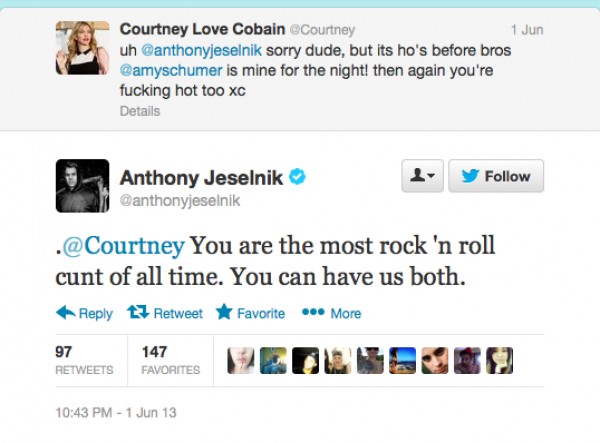 PHAWKER: Yes. You Tweeted, “Hoes before bros, Amy Schumer is mine for the night. But then again you are fucking hot too xc.” And he responded with, “You are the most rock ‘n roll cunt of all time. You can have us both!”