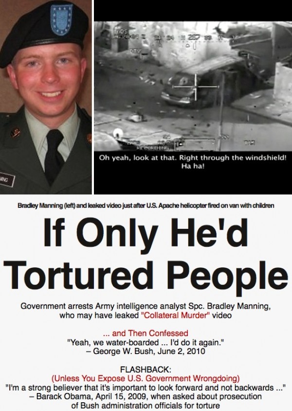 Bradley Manning didn’t bother with any of that. After his immediate supervisor in Iraq didn’t respond to his complaints the way he wanted, Manning did not write about his experiences or concerns elsewhere. He did not search out open information to expose wrongdoing or poor decision making. He did not petition his own government, or Congress, or his superiors in Baghdad, or in Washington, or join a protest. He made the leap from having a bad feeling about the war to leaking hundreds of thousands of secret documents to a shadowy organization on the Internet. MORE