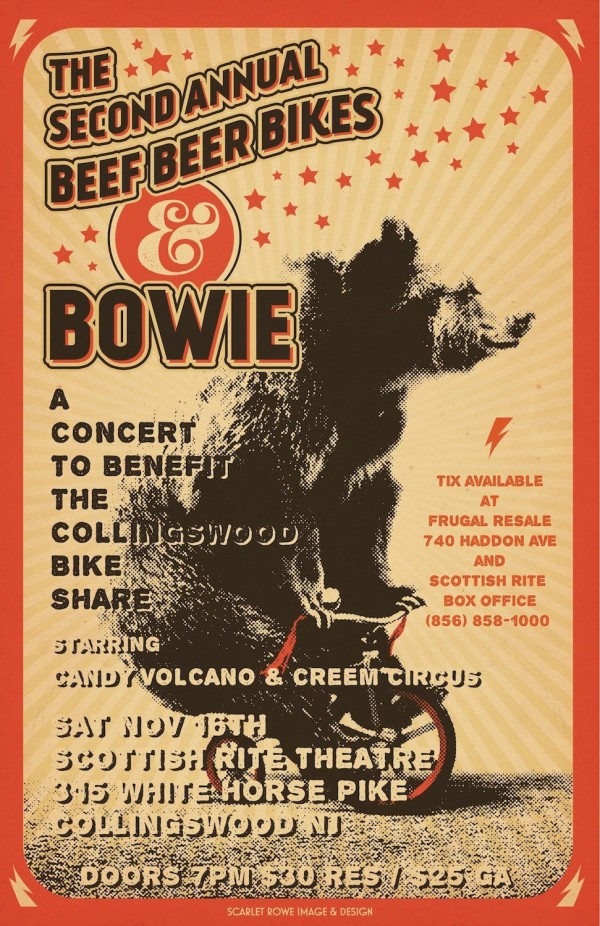 Joseph Bonaparte who heads the Collingswood Bike Share asked his buddy Kevin Monko, leader of the band Monko, to help him raise money for his non-profit, which suppies the neighborhood with affordable, green transportation. The two put their heads toghether and, out of their mutual love for Glam Rock decide to revive Bowie’s Ziggy Stardust album from start to finish with the help of the Collingwood music scene. The band they’ve assembled is pretty amazing, about 24 musicians in all. There is a core group of musicians including Kevin Monk- guitar and vocal, John Falco form Charming Snakes on guitar and vocals, Ned Sonstein whom you may remember from Zonic Shockum on drums and voice, Scarlet Rowe from Ricky Byrd and the Skeleton Crew on Bass, Joe Fasile on guitar and Ray Long on Piano, trombone and vocals. Fronting the band is a slew of local talent, each singing one or two songs from the Ziggy record and/or other classic Glam Rock covers. Singers include Pete Donnelly who has toured with Graham Parker and NRBQ, Chris DiPinto from Creem Circus and owner of DiPinto Guitars, and Shannon McGill from She Hates Me just to name a few.