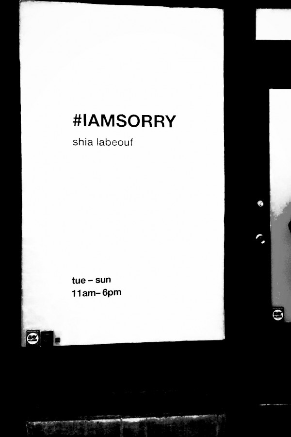 DAILY BEAST: In case you haven’t been on the Internet for the past few hours, let me fill you in on the latest in Shia-sanity. Starting [Tuesday] morning at 11:00 AM PT, LaBeouf ensconced himself in a tiny, empty art gallery at the corner of Beverly and Fuller in Los Angeles—directly across the street from the offices of BuzzFeed. The windows were glazed, with black letters affixed to them: #IAMSORRY Shia LaBeouf. The location suggested a work of art; the hashtag and seemingly strategic proximity to one of the world’s most successful viral content factories suggested an Internet stunt. It was a little bit of both. This gallery weirdness seemed like something that had been brewing for weeks. At a press conference Monday for Lars von Trier’s Nyphomaniac at the Berlin Film Festival, the 27-year-old actor was asked what it was like to do a movie with explicit sex scenes. LaBeouf, in a dirty baseball hat and missing one of his bottom teeth, answered by quoting a French soccer player: “When the seagulls follow the trawler, it is because they think sardines will be thrown into the sea.” He then walked out of the room. That wasn’t all. LaBeouf showed up to the premiere of the film with a paper bag over his head. “I AM NOT FAMOUS ANYMORE” (a phrase he’s tweeted every day for weeks) was written on the bag in sharpie. Last year, LaBeouf was accused of plagiarizing Daniel Clowes’s graphic novella Jusin M. Damiano for the short film HowardCantour.com. Initially, he claimed that he “got lost in the creative process and neglected to follow proper accreditation.” Then he was accused of plagiarizing his apologies. In January, LaBeouf said his plagiarism was really a hoax—a work of performance art that he would be chronicling with the hashtag #stopcreating. On January 10 he retired from public life. Which brings us to Beverly and Fuller. After waiting in line while four other people were shown into the gallery by a bouncer, one at a time, it was finally my turn to enter. The light was low. The room was empty. A young, arty woman stood behind a small plywood table. On it were artifacts from LaBeouf’s career: a whip (Indiana Jones and the Crystal Skull), a transformer (Transformers), and so on. There was a wrench, too, and some Hershey’s Kisses. There was even a book by Clowes himself—and a bowl full of hateful tweets inspired by LaBeouf’s plagiarism scandal. MORE