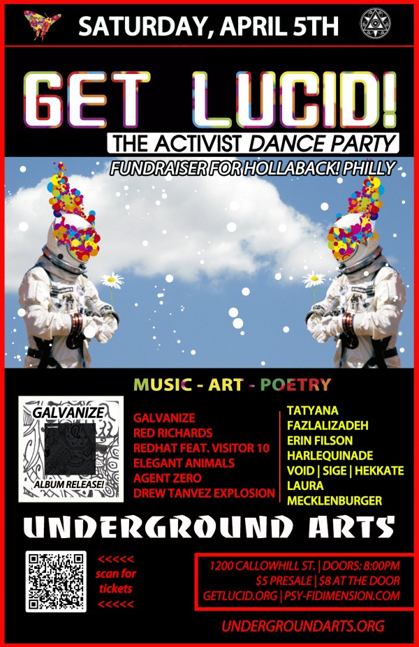 Get Lucid! is a Philadelphia-based organization shining the light of awareness on an array of environmental and communal causes in the City Of Brotherly Love. In their fight to direct greater awareness and fundraising dollars towards socially-conscious organizations, Get Lucid! has been hosting semi-regular dance parties at the Underground Arts, featuring local DJ’s, bands, and artists. On Saturday, Get Lucid! will be joined by co-hosts Psy.Fi at Underground Arts to support the efforts of HollabackPhilly — a group attempting to empower women and members of the LGBTQ community against objectification, violence and street harrassment. There will be live music from Galvanize, Red Richards, RedHat feat. Visitor 10, Elegant Animals, Agent Zero, and  Drew Tanvez Explosion. Saturday’s show will also serve as the Galvanize record release party.  There will also be photography and paintings by local artists like Tatyana Fazlalizadeh, Harlequinade Art, VOID, SIGE, and Laura Mecklenburger for sale. Spoken word and comedy will also be part of the rave-like dance party.  And did I mention there will be alcohol?  Don’t feel guilty — it’s all for a good cause. Doors open at 8pm on April 5 at the Underground Arts. $5 presale. $8 at the door. Click HERE for more info. — BRIEN EDWARDS