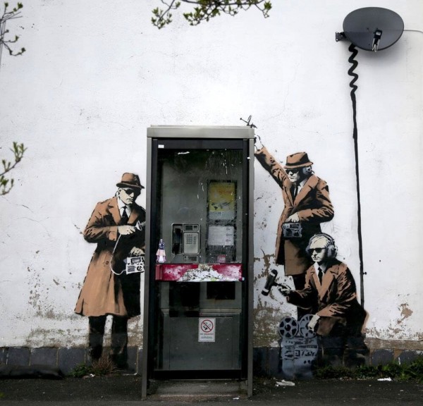 BBC: The artwork, which appeared in Cheltenham on Sunday, depicts three men wearing sunglasses and using listening devices to “snoop” on a telephone box. The piece has already attracted hundreds of visitors. Banksy has not yet claimed the work but it bears his hallmarks, say experts. Cheltenham street artist Dice67 claimed he had been told the artwork, which appeared on the corner of Fairview Road and Hewlett Road on Sunday morning, is indeed by Bristol artist Banksy. “It’s been all over the art forums. He’s tipped off a couple of people to come and see it – one guy flew in from France yesterday to take some photos of it.” MORE