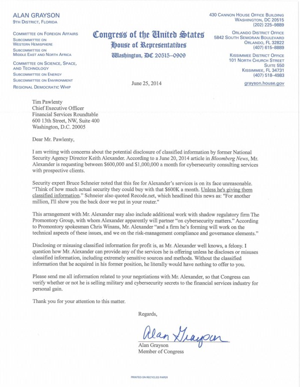 VICE NEWS: “Disclosing or misusing classified information for profit is, as Mr. Alexander well knows, a felony. I question how Mr. Alexander can provide any of the services he is offering unless he discloses or misuses classified information, including extremely sensitive sources and methods,” Florida Democratic Rep. Alan Grayson wrote one of the business groups, the Security Industries and Financial Markets Association (SIFMA), which holds it down for Wall Street in Washington. “Without the classified information that he acquired in his former position, he literally would have nothing to offer to you.” In an interview Monday, Grayson was even more strident in his criticism. “Frankly, what the general is doing is beginning to resemble an extortion racket,” he told me. “This is a man who basically lied for a living, and he continues to do that.” MORE
