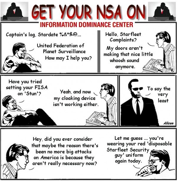 THE GUARDIAN: But a perhaps even more disturbing and revealing vignette into the spy chief’s mind comes from a new Foreign Policy article describing what the journal calls his “all-out, barely-legal drive to build the ultimate spy machine”. The article describes how even his NSA peers see him as a “cowboy” willing to play fast and loose with legal limits in order to construct a system of ubiquitous surveillance. But the personality driving all of this – not just Alexander’s but much of Washington’s – is perhaps best captured by this one passage, highlighted by PBS’ News Hour in a post entitled: “NSA director modeled war room after Star Trek’s Enterprise”. The room was christened as part of the “Information Dominance Center”: