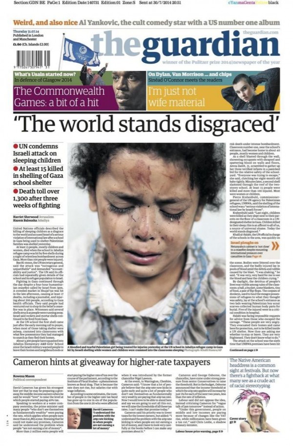 THE GUARDIAN: United Nations officials described the killing of sleeping children as a disgrace to the world and accused Israel of a serious violation of international law after a school in Gaza being used to shelter Palestinian families was shelled on Wednesday. At least 15 people, mostly children and women, died when the school in Jabaliya refugee camp was hit by five shells during a night of relentless bombardment across Gaza. More than 100 people were injured. Ban Ki-moon, the UN secretary general, said the attack was “outrageous and unjustifiable” and demanded “accountability and justice”. The UN said its officials had repeatedly given details of the school and its refugee population to Israel. A Palestinian girl cries while receiving treatment for her injuries caused by an Israeli strike. Fighting in Gaza continued through the day despite a four-hour humanitarian ceasefire called by Israel from 3pm. A crowded market in Shujai’iya was hit in the late afternoon, causing at least 17 deaths, including a journalist, and injuring about 200 people [SEE VIDEO, BELOW], according to Gaza health officials. They said people had ventured out to shop in the belief a ceasefire was in place. Witnesses said several shells struck as people were running away. Israel said rockets and mortar shells continued to be fired from Gaza. Israel on Thursday was showing no sign of scaling back Operation Protective Edge, with the military reportedly calling up an additional 16,000 reserves as the offensive entered its 24th day.