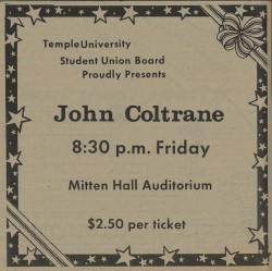 University Libraries, Ars Nova Workshop and Resonance Records will host a panel discussion on this historic concert with noted Philadelphia-based jazz critic and author Francis Davis (who was in attendance at the concert as an undergraduate student at Temple) and noted Sun Ra biographer and jazz historian John Szwed, local Philadelphia percussionist Robert Kenyatta (who played with Coltrane that night in ‘66) and Baltimore saxophonist Carl Grubbs, who was in attendance and is related to Coltrane’s first wife, Naima. The panel will be moderated by J. Michael Harrison of WRTI-FM, host of “The Bridge,” a 15-year-old program that bridges the gap between jazz and hip-hop and other contemporary black music. For more information, go HERE.