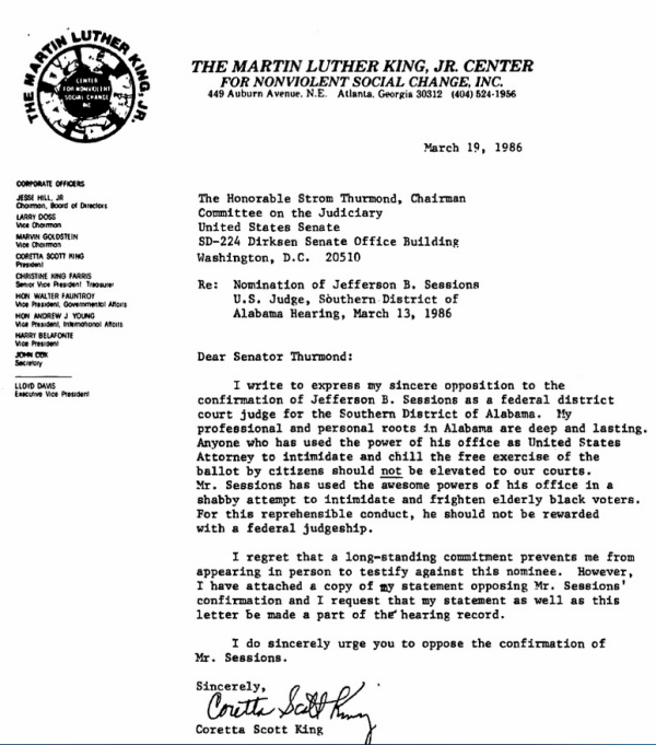 WASHINGTON POST: Coretta Scott King, the widow of civil rights leader Martin Luther King Jr., urged Congress in a letter to block the 1986 nomination of Jeff Sessions for federal judge, saying that allowing him to join the federal bench would “irreparably damage the work of my husband.” The letter, previously unavailable publicly, was obtained on Tuesday by The Washington Post.