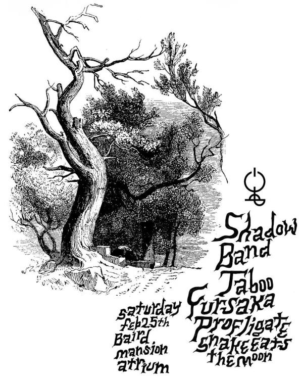 SHADOW BAND: Word yeah, I mean we like anything that’s spooky I guess. But uh, you know the Incredible String Band? They’re like a mutual thing we can all dig on I guess. They’re kind of a collective and we’re a collective so play in that way as well. I believe they have three songwriters and a few others but they’re still a collective. Yeah they’re pretty incredible as per their name. There’s a thing about modern bands with a similar vibe to us. Sun City Girls and the Sunburned Hand of the Man, out of New England I think have a pretty similar vibe to us. We like sun themed bands. Also Sun O)))) Although our music tends towards the quieter I side I think all of us tend towards the kind of doom or sludge. Any sonically abrasive heavy thing.