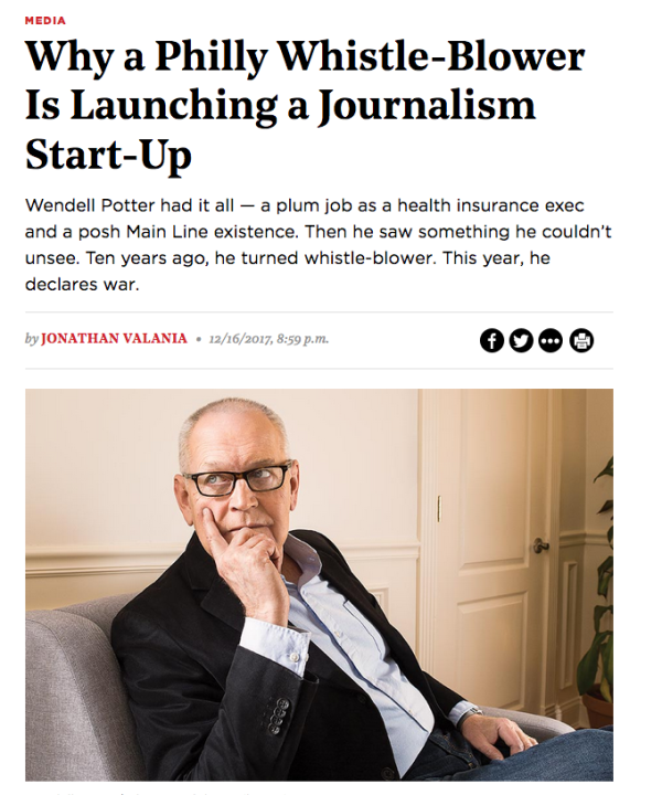 PHILADELPIHA MAGAZINE: Even by the biblical standards of come-to-Jesus moments, the day Wendell Potter got woke was nothing short of miraculous, in the old-school, divine-intervention meaning of the word. The year was 2007, and Potter was the vice president of corporate communications for Cigna, the global health insurance behemoth then headquartered in Center City. As such, he was, in essence, a handsomely paid apologist in a for-profit health insurance system that — in the dark age that preceded the signing into law of the Affordable Care Act — routinely left more than 40 million Americans without coverage, resulting in nearly 45,000 premature deaths annually.