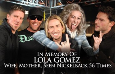 of you dressed up like somebody’s mom sticking her tongue out and flashing the devil horns with the guys from Nickelback, and it says “Lola Gomez Wife, Mother, Seen Nickelback 56 Times.” What is that from? Is that a skit?