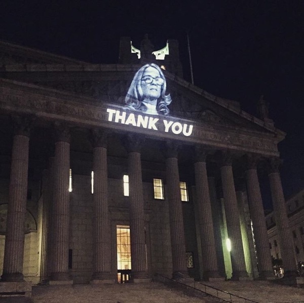 SIDEWALKING: Thank You For Your Service by: PhawkerPosted on: September 30, 2018November 15, 2022 Image of Dr. Christine Blasey Ford projected on the edifice of the New York State Supreme Court in downtown Manhattan Friday night to Saturday morning.