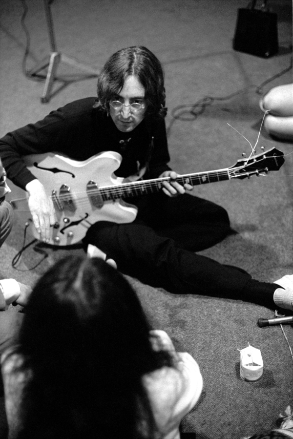Upon returning to England from Rishikesh, India, in April, 1968, John Lennon and George Harrison stripped and sanded the psychedelic paintwork off of their Gibson J-160E and Casino guitars; Donovan, one of the many musicians who had accompanied them to the Maharishi Mahesh Yogi’s ashram for an advanced transcendental-meditation course, had told them that this would improve the sound. “If you take the paint and varnish off