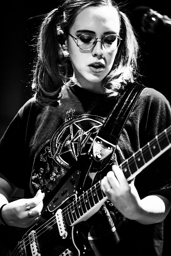 Wearing oversized wire-frame aviators and high pigtails supported by a small army of shiny barrettes, Sophie Allison serenaded a sold-out crowd of Philadelphia fans at the First Unitarian Church last night with her band, Soccer Mommy. Soccer Mommy’s early bedroom pop work evolved into the highly praised Clean, a 2018 record that deals with love, loss, and the overall existential struggles of most every young adult. It’s music that makes you crave the warmth of another while simultaneously feeling the pain of punching through the walls that Allison described in “Henry,” the opening song of the night.