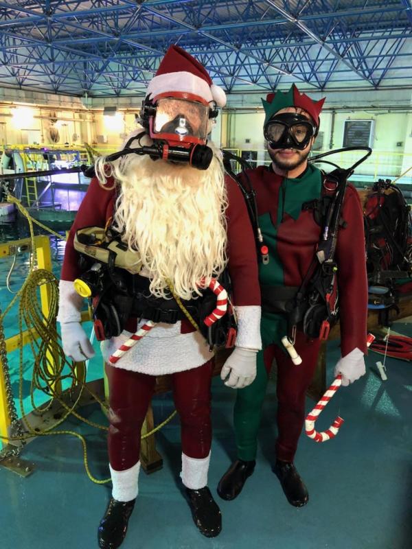 However, when Waldo swims by these days, the kids shoo him away, because he’s only getting in between them and a chance to get some face time with Scuba Santa. It’s Christmas season at Adventure Aquarium, so until Christmas day our traditional dive show has been replaced with a tree decorating ceremony and a special appearance by Scuba Santa and his elf helpers. At the end of the show, the kids chant, “I believe in Scuba Santa. I believe in Scuba Santa,” and once they believe hard enough, we arrive on the scene. As a slimmer member of Dive Team 13, I play the part of one of the elves, and just like Waldo, the kids shrug me off, as I’m only another obstacle in their way of getting to their beloved Scuba Santa.
