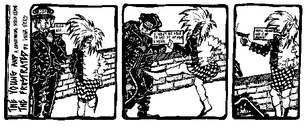 ELIZABETH FIEND: My first comic was three frames. A cop says “nice ass” to a punk. She kicks him in the groin; he says “I won’t be able to get it up for a week.” She reaches into her leather; pulls a gun; shoots him, remarking “You’ll never get it up again.” A few months later Mumia Abu-Jamal was arrested and charged with killing police officer William Faulkner. Philly 1981, was a time and place where a cop could be threatening to arrest you and checking out your legs — at the same time.