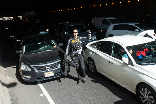 Some drivers kept their windows up, many were filming. There was no evidence of protesters damaging cars, being hostile, or putting anyone’s life in danger. The atmosphere was positive, and as we marched, it appeared the drivers had accepted they were engaged in non-violent civil disobedience. After marching eastbound for several minutes, the front of the march suddenly devolved into chaos as panicked protesters began sprinting westbound, in the opposite direction of the march. It happened very suddenly and I wasn’t close enough to the front to see what had happened. I turned around and began running while continuing to take photos. I asked a girl what happened, and she told me police officers were firing tear gas at the crowd. I continued to run with the crowd, which was quickly turning into a panicked stampede. Every single protester in sight had their hands raised up in the air as they moved quickly to escape the tear gas.