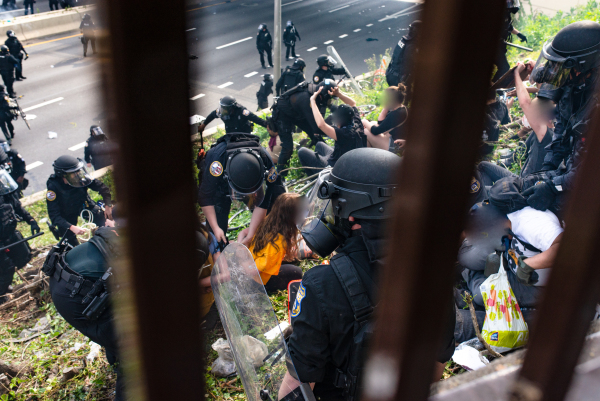 I heard a woman screaming “somebody help me up” but nobody was helping her. I stopped filming and went to give her a leg up with my hands. As I pushed her up, the tear gas flooded my eyes and throat, and I was suffocating. I ran away and ran back several times, withstanding what I could from the gas. Everybody in the vicinity was coughing loudly and in agony. I took out my camera and began photographing through the fence as police officers dressed in riot gear and gas masks approached the remaining protesters on the hill and began arresting them.