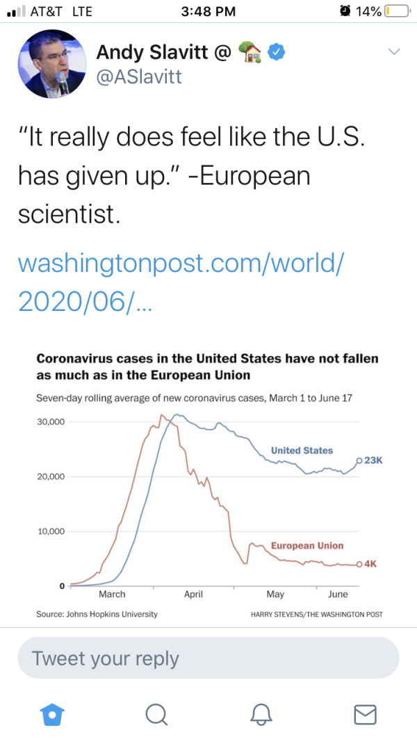 Here’s to the quitter-in-chief, who’s decided that competently managing the pandemic with masks and social distancing and shared sacrifice to minimize the loss of life is just too hard and that 200,000 dead Americans by October is a justifiable cost of getting the Dow back to a re-electable number.